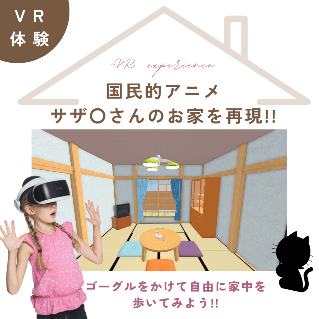 国民的アニメ サザ〇さんのお家をVRでバーチャル体験。テレビでしか見る事のないアニメの世界へゴーグルをかけて実際に歩き回っているような体験ができます。