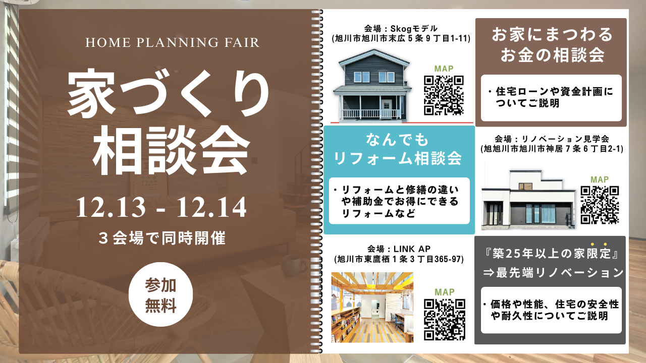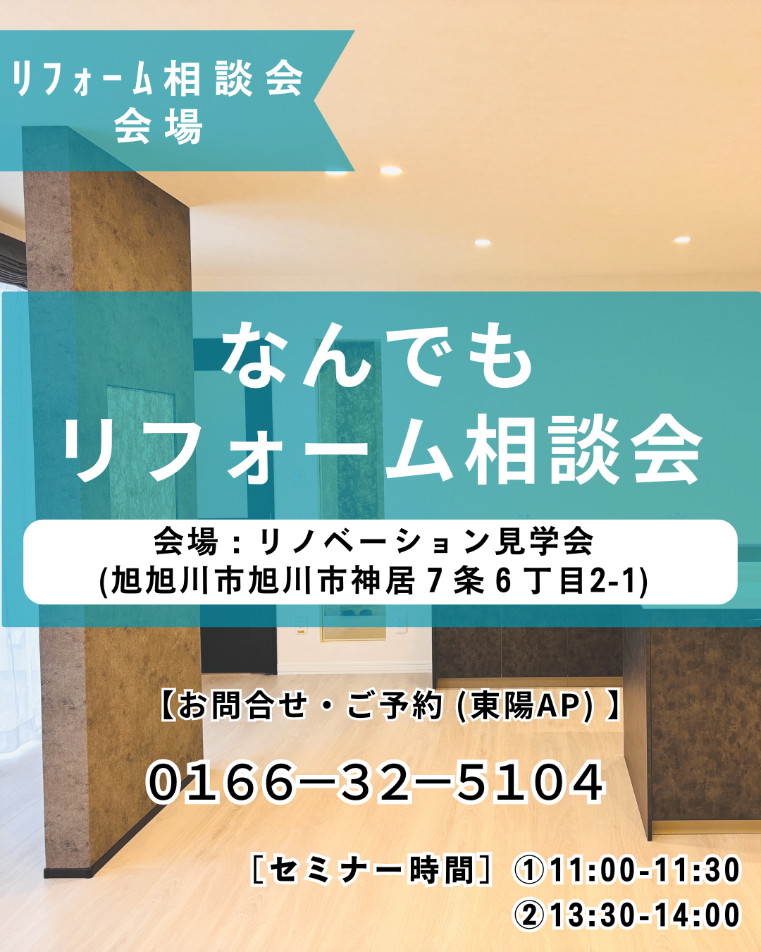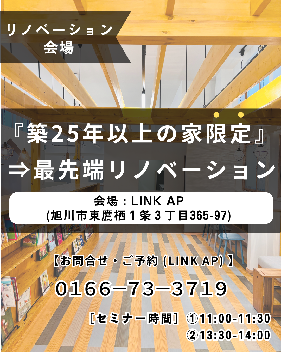 | 会場 | 【会場①】 リノベーションモデルハウス / 旭川市末広5条9丁目1-11 【会場②】 リノベーション住宅 / 旭川市神居7条6丁目2-1 【会場③】 イベント会場 LINKAP / 旭川市東鷹栖1条3丁目635-97 |